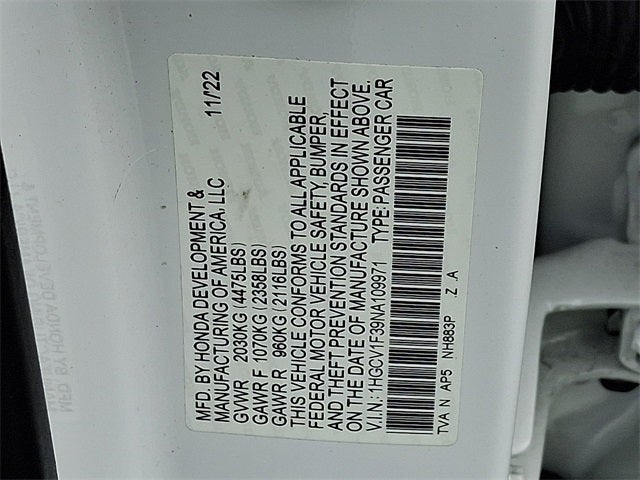 White 2022 Honda Accord Sport FWD CVT 1.5T I4 DOHC 16V Turbocharged VTEC