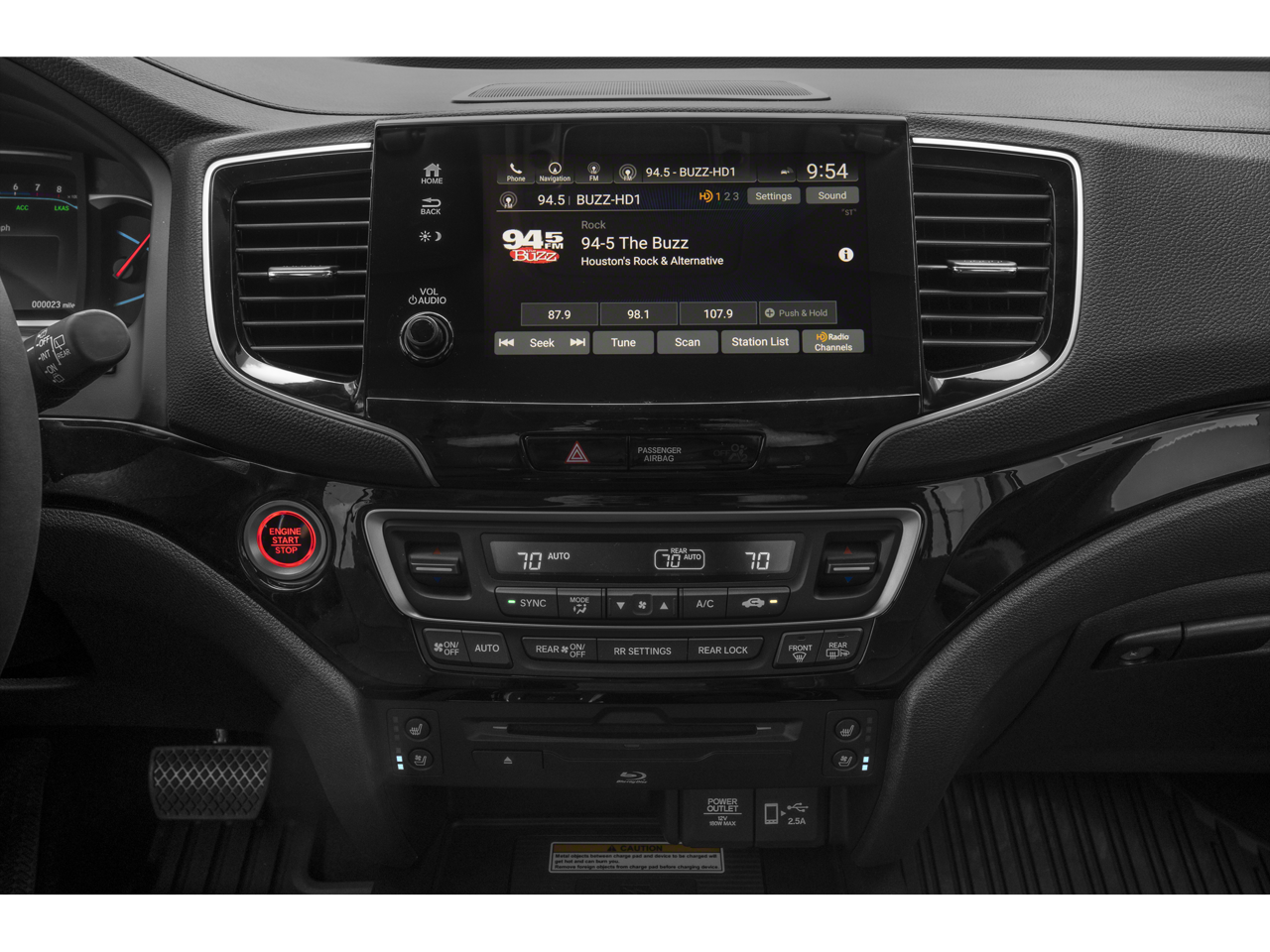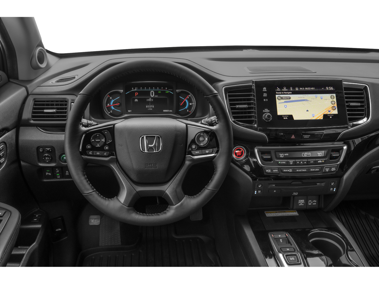 AWD, 10 Speakers, 3rd row seats: split-bench, 4-Wheel Disc Brakes, 4.33 Axle Ratio, A/V remote: CabinControl, ABS brakes, Air Conditioning, Alloy wheels, AM/FM radio: SiriusXM, Apple CarPlay/Android Auto, Auto High-beam Headlights, Auto-dimming door mirrors, Auto-dimming Rear-View mirror, Automatic temperature control, Blind Spot Information (BSI) System warning, Brake assist, Bumpers: body-color, Compass, Delay-off headlights, Driver door bin, Driver vanity mirror, Dual front impact airbags, Dual front side impact airbags, Electronic Stability Control, Emergency communication system: HondaLink, Exterior Parking Camera Rear, Forward collision: Collision Mitigation Braking System (CMBS) + FCW mitigation, Four wheel independent suspension, Front anti-roll bar, Front Bucket Seats, Front Center Armrest, Front dual zone A/C, Front fog lights, Front reading lights, Fully automatic headlights, Garage door transmitter: HomeLink, Headphones, Heated & Ventilated Front Bucket Seats, Heated door mirrors, Heated front seats, Heated rear seats, Heated steering wheel, Illuminated entry, Lane departure: Lane Keeping Assist System (LKAS) active, Low tire pressure warning, Memory seat, Navigation system: Honda Satellite-Linked Navigation System, Occupant sensing airbag, Outside temperature display, Overhead airbag, Overhead console, Panic alarm, Passenger door bin, Passenger vanity mirror, Perforated Leather Seat Trim, Power door mirrors, Power driver seat, Power Liftgate, Power moonroof, Power passenger seat, Power steering, Power windows, Radio data system, Radio: 590-Watt Premium Audio System, Rain sensing wipers, Rear air conditioning, Rear anti-roll bar, Rear audio controls, Rear reading lights, Rear window defroster, Rear window wiper, Reclining 3rd row seat, Remote keyless entry, Roof rack: rails only, Security system, Speed control, Speed-sensing steering, Speed-Sensitive Wipers, Split folding rear seat, Spoiler, Steering wheel mounted audio controls, Tachometer, Telescoping steering wheel, Tilt steering wheel, Traction control, Trip computer, Turn signal indicator mirrors, Variably intermittent wipers, Ventilated front seats, and Wheels: 20 Machine-Finished Alloy.