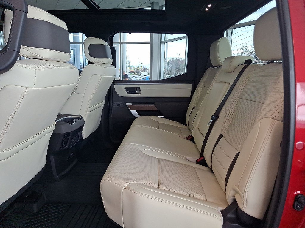 Experience luxury and power in this stunning Red 2023 Toyota Tundra 1794 Edition HV CrewMax 4x4. With a robust 3.4L Hybrid Twin Turbo V6 delivering 437hp, this truck blends performance with efficiency. Enjoy advanced tech, including a massive 14-inch Toyota Audio Multimedia touchscreen with wireless Android Auto and Apple CarPlay, JBL premium sound, and navigation with over-the-air updates. The 1794 Edition's Western-themed leather-trimmed interior features heated and ventilated seats, a panoramic moonroof, wood accents, and customizable digital instrument cluster. Stay safe with Toyota's suite of driver assists: adaptive cruise, lane keeping, surround view camera, intersection emergency braking, and blind spot monitoring. Smart features like trailer backup guidance, power tailgate, spray-on bedliner, and rear USB-C outlets make towing and work a breeze. This Tundra offers a perfect blend of capability, comfort, and cutting-edge technology. Schedule your test drive today and experience the ultimate in full-size hybrid truck luxury.