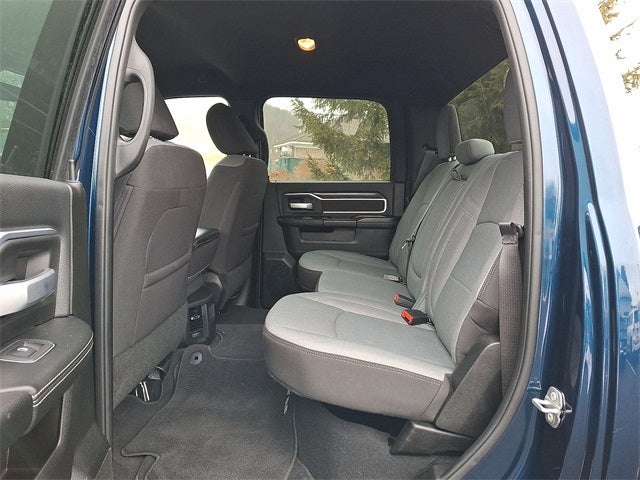 Bed Utility Group (LED Bed Lighting, MOPAR Deployable Bed Step, and MOPAR Spray In Bedliner), Protection Group (Tow Hooks), Quick Order Package 2GZ Big Horn, 2 Way Rear Headrest Seat, 3.73 Axle Ratio, 4 Way Front Headrests, 4-Wheel Disc Brakes, 40/20/40 Split Bench Seat, 6 Speakers, ABS brakes, Active Noise Control System, Air Conditioning, Anti-Spin Differential Rear Axle, Black Exterior Mirrors, Bluetooth® Handsfree Phone & Audio, Brake assist, Bumpers: chrome, Center Hub, Center Stack Storage Drawer, Chrome Flat Cab-Length Side Steps, Cloth 40/20/40 Bench Seat, Compass, Connectivity - US/Canada, Delay-off headlights, Driver door bin, Dual front impact airbags, Dual front side impact airbags, Electronic Stability Control, Electronically Controlled Throttle, Emergency communication system: SiriusXM Guardian, Exterior Mirrors w/Heating Element, Front anti-roll bar, Front Center Armrest w/Storage, Front Fog Lamps, Front License Plate Bracket, Front reading lights, Fully automatic headlights, Global Telematics Box Module (TBM), GPS Antenna Input, Heated door mirrors, Illuminated entry, Integrated Center Stack Radio, Integrated Voice Command w/Bluetooth®, Low tire pressure warning, Manual Adjust 4-Way Driver Seat, Manufacturer's Statement of Origin, Occupant sensing airbag, Outside temperature display, Overhead airbag, Overhead console, Panic alarm, ParkView Rear Back-Up Camera, Passenger door bin, Passenger vanity mirror, Power 2-Way Driver Lumbar Adjust, Power Adjust Mirrors, Power door mirrors, Power steering, Power windows, Radio data system, Radio: Uconnect 3 w/5 Display, Radio: Uconnect 5 W w/8.4 Display, Rear anti-roll bar, Rear Folding Seat, Rear seat center armrest, Rear step bumper, Remote keyless entry, SiriusXM Radio Service, Speed control, Tachometer, Tilt steering wheel, Tip Start, Traction control, Trip computer, Turn signal indicator mirrors, Variably intermittent wipers, Voltmeter, and Wheels: 18 x 8.0 Steel Chrome Clad.