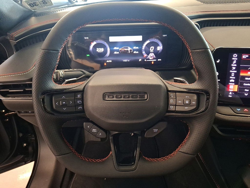 Experience the future of muscle cars with this Black 2025 Dodge Charger AWD Daytona R/T Coupe, boasting just 1,711 miles. Powered by a thrilling 496hp electric motor and all-wheel drive, it delivers performance and efficiency with up to 308 miles per charge and DC fast charging capability. Enjoy advanced technology like a 12.3-inch Uconnect infotainment system, wireless Apple CarPlay and Android Auto, TomTom navigation, and Amazon Alexa compatibility. Safety is prioritized with adaptive cruise control, lane keeping assist, front and rear automatic emergency braking, pedestrian detection, and blind spot integration. Comfort features include heated front seats, a heated steering wheel, leatherette/cloth performance seats, and dual-zone automatic climate control. Convenience abounds with push-button start, power folding mirrors, and a host of smart device app functions. This Charger blends iconic style, cutting-edge tech, and pure electric exhilaration-ready for your next adventure.